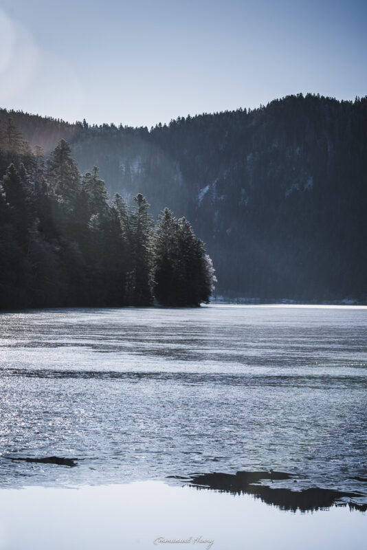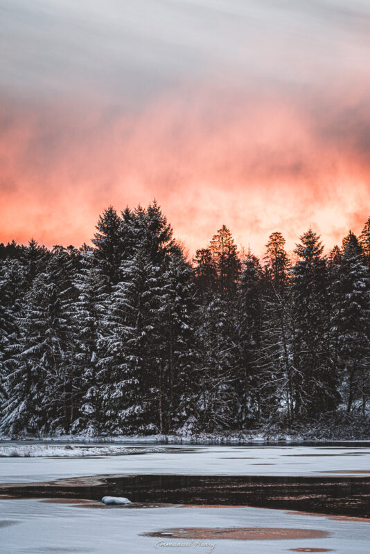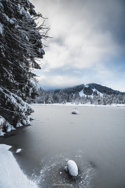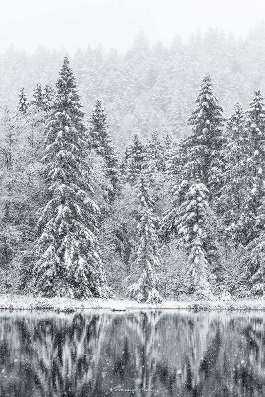 C’est ce que j’ai voulu capturer dans cette série. Ces instants où les Vosges se parent de blanc et où tout semble suspendu. Le lac gelé. Les sapins immobiles. La neige qui tombe sans bruit.