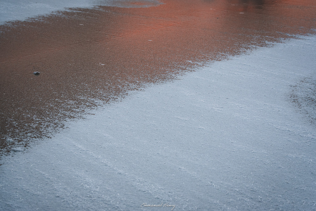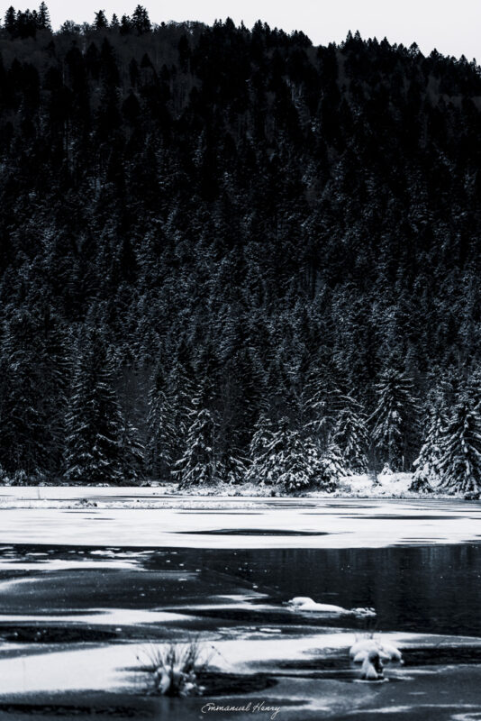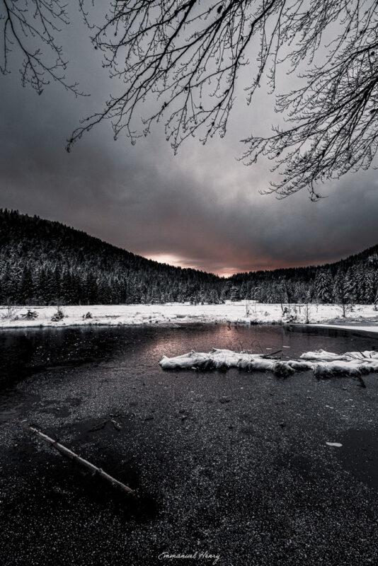 Cette série, “Le Monde au silence de velours”, est née au cœur de ces instants suspendus. Des paysages enneigés, des tourbières profondes aux reflets sombres, des détails de nature givrée… autant de scènes où le gel transforme le réel en poésie visuelle.