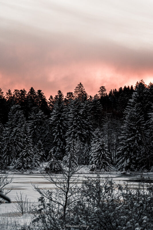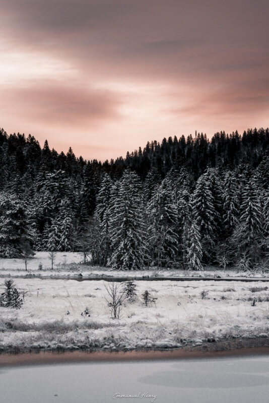 Chaque photographie explore la rencontre entre la neige fraîche, la lumière du matin et l’atmosphère mystérieuse des tourbières. L’eau noire devient miroir, les brindilles glacées scintillent comme des bijoux, et les cimes se teintent de feu sous le lever du jour.