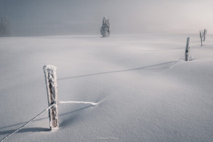 Un Monde Blanc, entre neige, ciel et forêt de sapins.