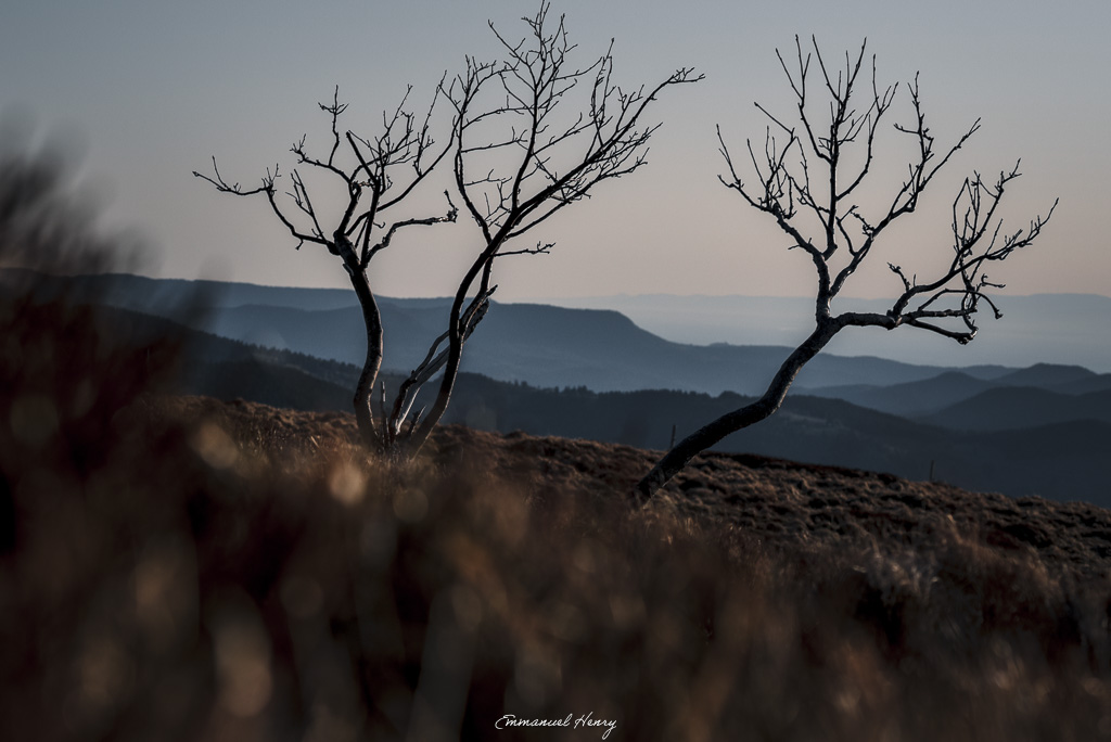 Sur les crêtes vosgiennes, un arbre façonné par le vent défie le temps. Une image de force et de résilience, symbole de nature sauvage.
